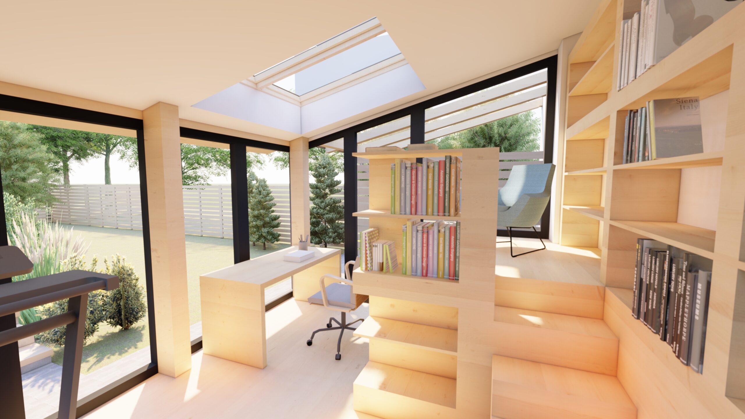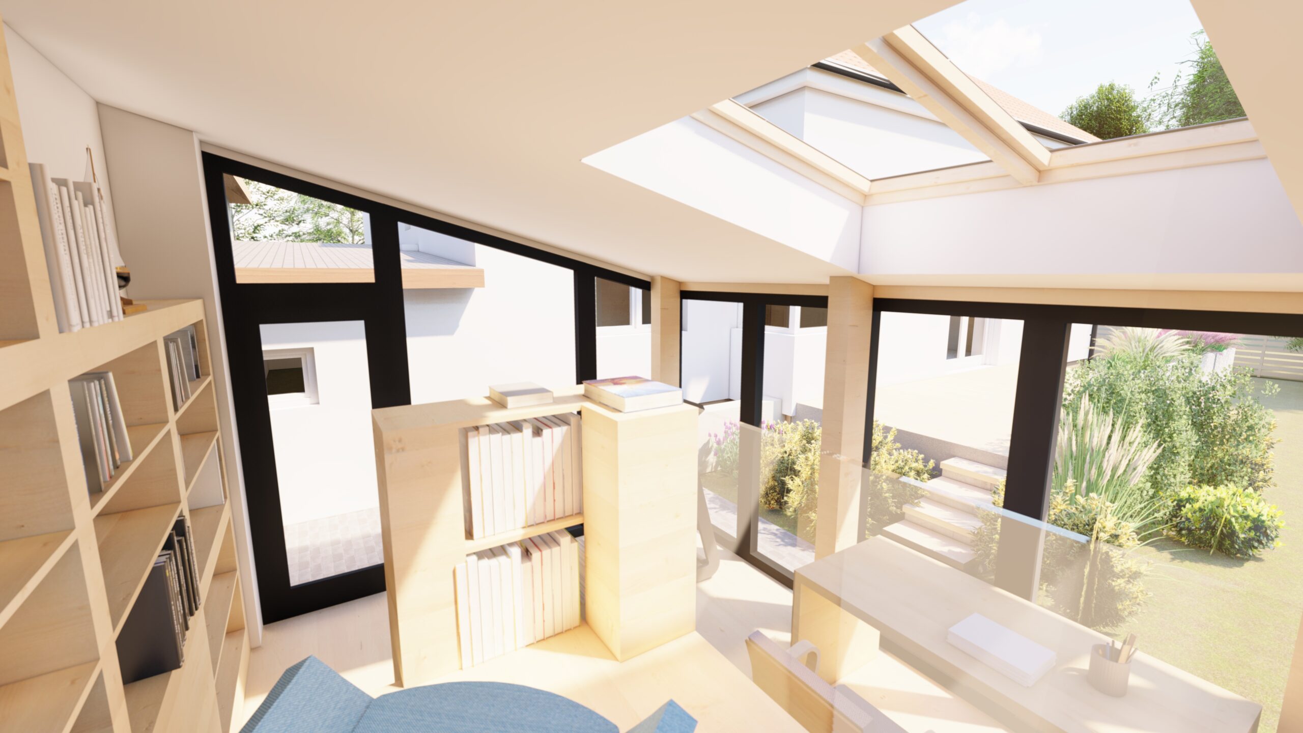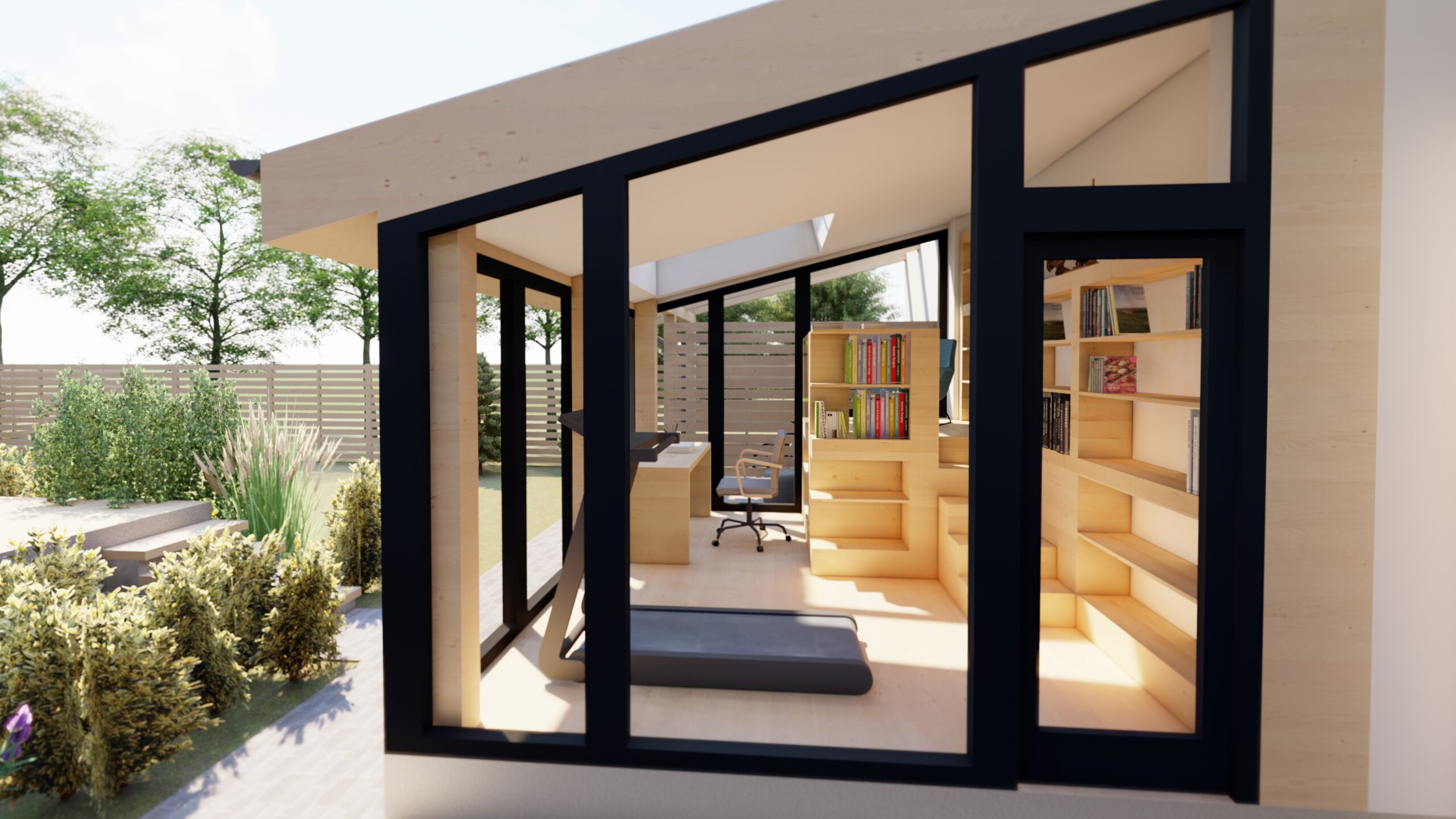 Megrendelő egy dolgozó szobát szeretett volna kialakítani. Mivel a főépülethez az alaprajzi kötöttségek miatt nehézkes lett volna egy toldalékot hozzáépíteni, így a dolgozó szobát önálló építményként terveztük meg.